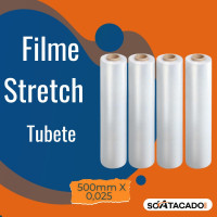 Filme Stretch Virgem 500mm x 0,025 com Tubete, oferecendo alta elasticidade, transparência e proteção para armazenamento, embalagem e transporte.