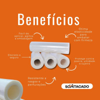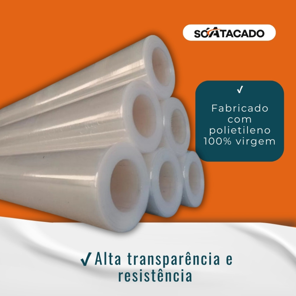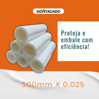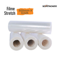 Filme Stretch para proteção e acondicionamento, com 500mm de largura e espessura de 0,025 mic, feita em polietileno e cor transparente.