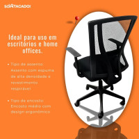 - Encosto em tela mesh: Favorece a ventilação e evita o acúmulo de calor